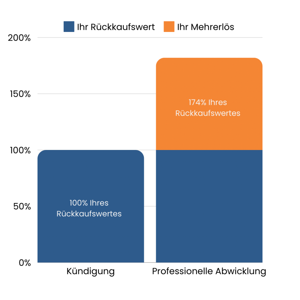 Bei einer Rückabwicklung erhalten Sie häufig 1,5–2-mal so viel wie bei einer einfachen Kündigung. Alle bisher eingezahlten Beiträge werden unter Berücksichtigung aller Erträge zurückgezahlt, während bei einer Kündigung oft nur der Rückkaufswert ausgezahlt wird.